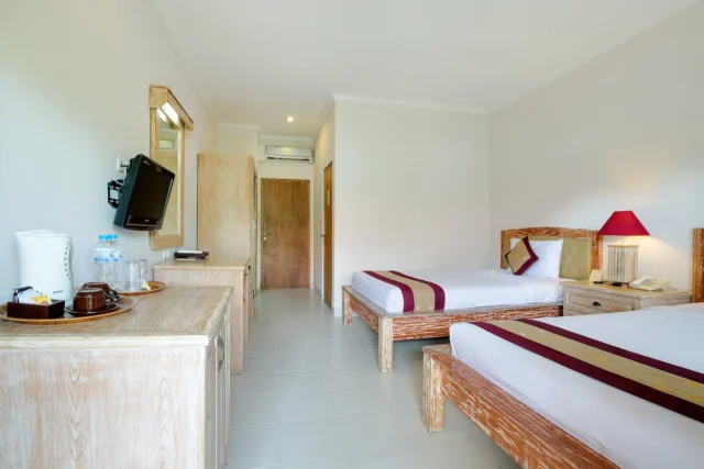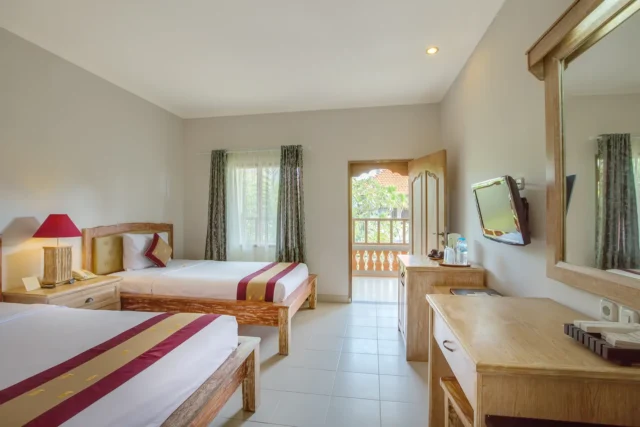 Located on the upper & ground floor designed to accommodate up to 2 persons, with the option of a queen and twin beds. Its balcony overlooking the tropical garden and swimming pool. These 30m2 contemporary Balinese rooms come with a 32-inch flat-screen TV, Air Conditioning, en-suite bathroom, bathtub shower, and amenities