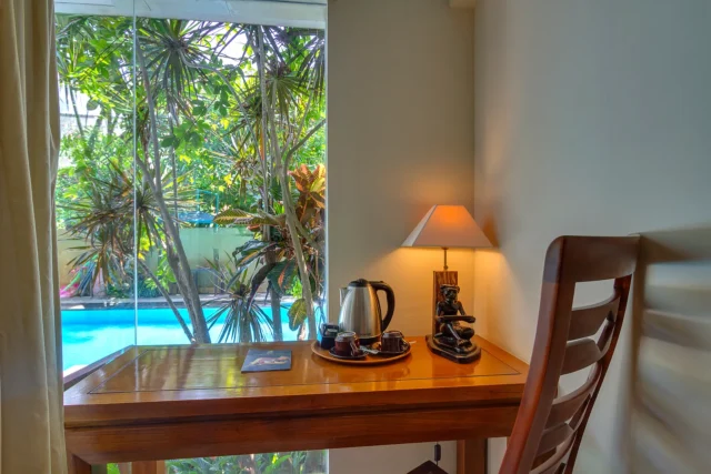 Located on the ground floor and designed to accommodate up to 2 persons, with the option of a queen bed or twin beds. Its terrace overlooks the tropical garden and swimming pool.