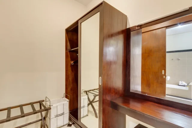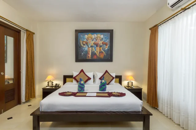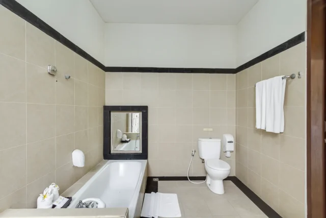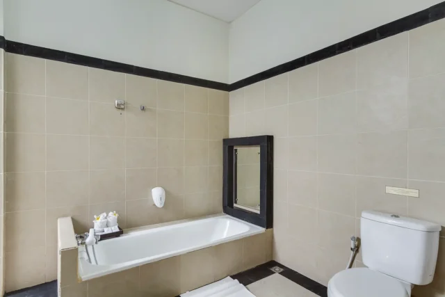 Located on the ground floor and designed to accommodate up to 3 persons, with a private living room, which is equipped with a kitchenette, and dining table. These 48m2 modern-minimalist rooms come with a 32-inch flat-screen TV, Air Conditioning, en-suite bathroom, bathtub shower, standing open shower, and amenities.