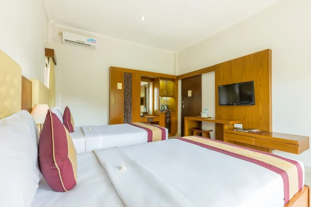 Located on the upper floor and designed to accommodate up to 2 persons, with the option of a queen and twin beds.Its balcony overlooks the tropical garden and/or swimming pool. These 34m2 modern-minimalist rooms come with a 32-inch flat-screen TV, air conditioning, en-suite bathroom, standing shower, and amenities.