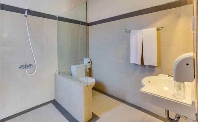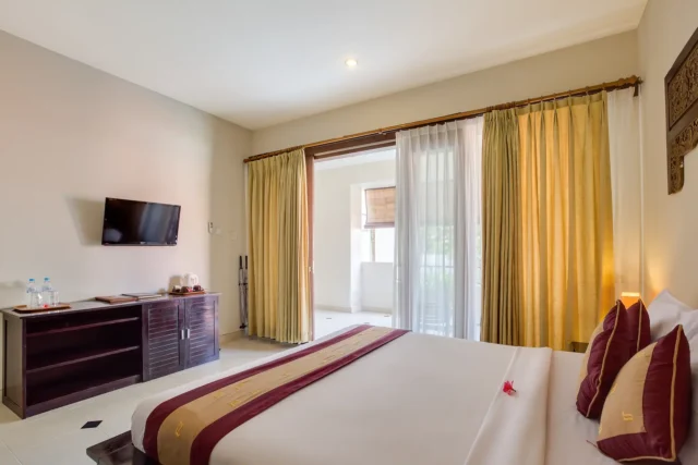 Located on the 1nd floor and 2nd floor designed to accommodate up to 3 persons, with the option of 1 queen-size bed or 2 single beds. Its balcony overlooks the tropical garden. These 30m2 modern-minimalist rooms come with a 32-inch flat-screen TV, Air Conditioning, en-suite bathroom, standing shower, and amenities